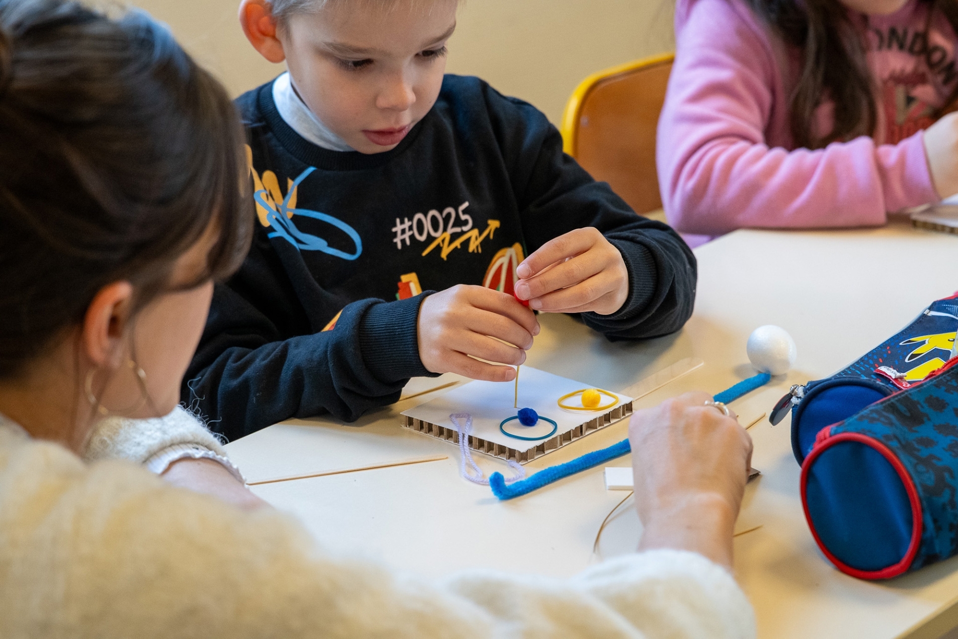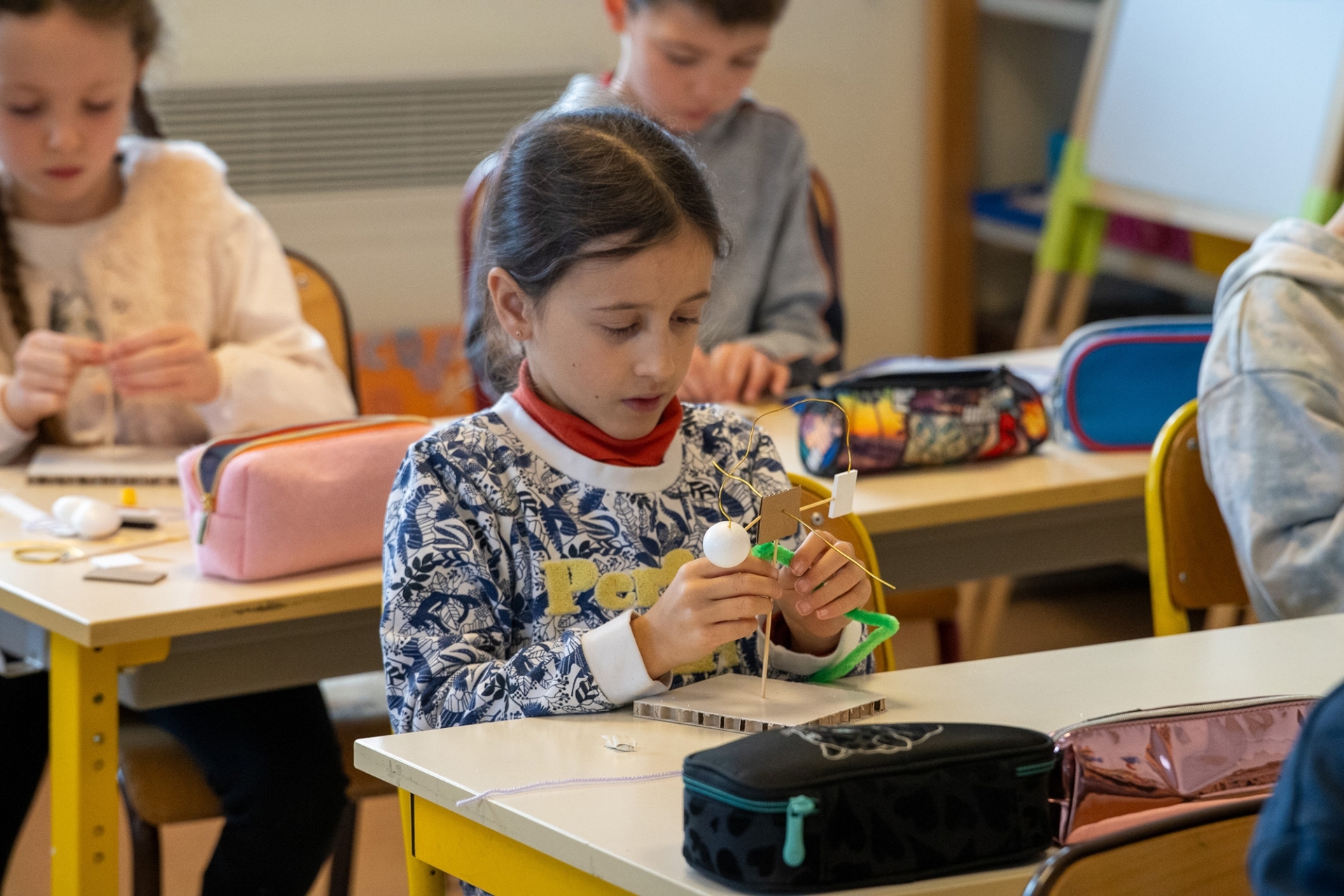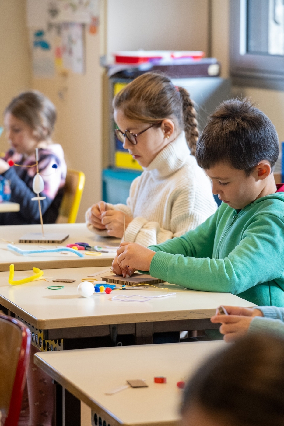 Les enfants ont pris le temps de chercher, d’imaginer et d’inventer des structures en équilibre, d’abord en 2D, puis en 3D.