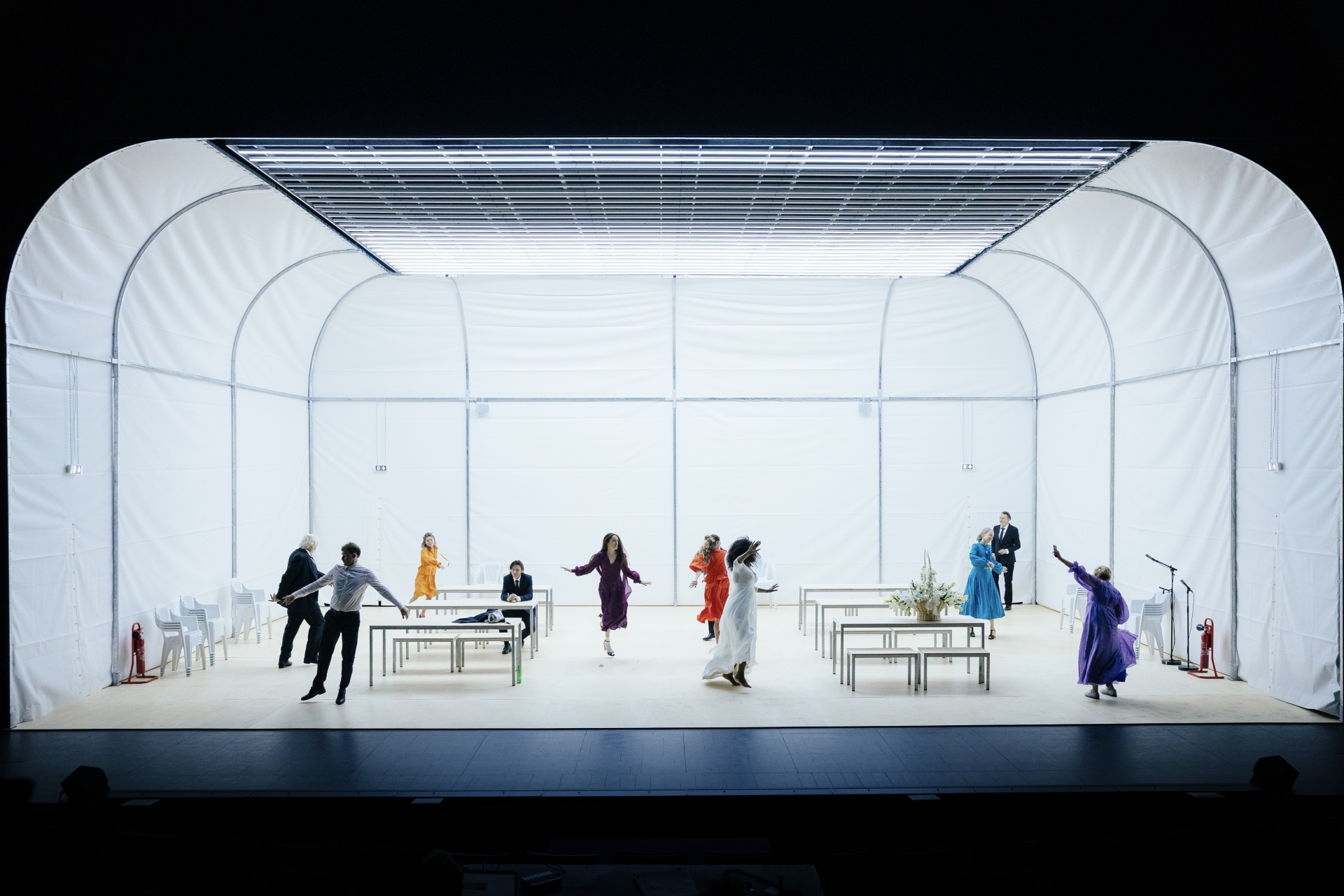 En suivant une famille sur plusieurs générations, mettant en lumière les moments saillants de chaque existence, Pascal Rambert entame une réflexion sur le temps. Celui qui passe sur les personnages, mais qui passera également sur ses acteurs, que l’on retrouvera tout au long de la trilogie. Un compagnonnage artistique rare et précieux, qui engendre une écriture sculptée à même leur corps et leur énergie. Le déploiement du temps permet un regard sur la généalogie de nos actes, et leurs conséquences sur nos existences. Elles peuvent en être écrasées ou magnifiées, la destruction pouvant être le lieu d’un nouveau départ. D’enterrements en mariages, on suit un noyau familial qui se compose et se décompose sous nos yeux. Ces moments-là sont des moments ouverts, face à nous, comme des grenades prêtes à exploser. Car c’est là que les vérités fusent et transpercent.